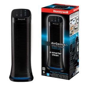 KAZ Honeywell AirGenius5 Air Cleaner/Odor Reducer - Black. Captures up to 99.9% microscopic particles as small as 0.3 microns; Freshens air by absorbing odors; Accent lighting with high, low, off settings; ENERGY STAR rated; Easy to clean, permanent washable primary filter; Includes 2 pre-filters (1 permanent & 1 odor-reducing); 5 cleaning levels & filter check indicator; 2-12 hr auto off timer, optional oscillation, & allergen & germ intelligence settings; Cap Sense, easy tap UI Control; AHAM CADR (smoke): 161/ For large rooms (250 sq ft.)